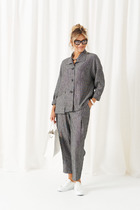 Костюм двухпредметный: состоящий из блузки и брюк. Блузка-туника А-силуэта, двойная с фигурным низом. Вырез горловины круглый, рукав летучая мышь.