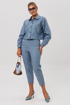 Жакет свободного силуэта с застежкой по переду на кнопки. Воротник отложной. По переду отрезные кокетки, накладные карманы с клапанами. По спинке кокетка и рельефы. Рукав двухшовный с притачной манжетой на кнопках. Низ жакета на притачном поясе.