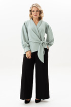 Брюки прямого силуэта с эмитацией запаха на притачном поясе. По переду застежка на тесьму-молнию. По боковым действующие карманы.
