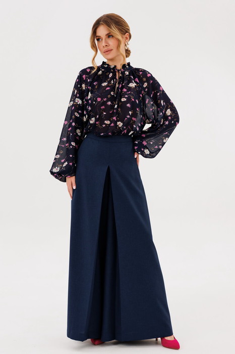 Юбка-брюки А-силуэта с застежкой на потайную тесьму молнию с притачным поясом и карманами спереди. По переду встречная складка.