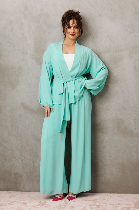 Элегантный вечерний костюм-двойка, состоящий из блузки свободного кроя и широких брюк. Красивый и эффектный брючный костюм - это идеальный образ для особых случаев, вечерних выходов, праздничных и торжественных мероприятий, будь то корпоратив, свадьба, юбилей, выпускной, день рождения, Новый год  Блузка прямого силуэта  со пущенной линией плеча. Рукав двойной, расширенный к низу со складками. По спинке и полочке идет планка. В комплекте с блузкой идет съемный пояс. На концах пояса металлизированная бахрома. Брюки прямые  с запахом по переду, пояс на резинке.Благодаря фасону и крою, костюм визуально вытянет силуэт, сделает фигуру стройнее, подчеркнет ее достоинства, скроет недостатки. Элегантный брючный костюм от Anastasia-   комфорт и уверенность в себе на любом мероприятии Длина блузки: (48-56)-61см. Длина рукава-52см. Длина брюк:(48-54)-105см., (56)-108см.
