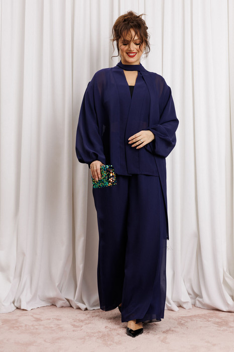 Элегантный вечерний костюм-двойка из шифона, состоящий из блузки свободного кроя и широких брюк. Красивый и эффектный брючный костюм - это идеальный образ для особых случаев, вечерних выходов, праздничных и торжественных мероприятий, будь то корпоратив, свадьба, юбилей, выпускной, день рождения, Новый год  Блузка прямого силуэта из шифона  со пущенной линией плеча. Рукав двойной, расширенный к низу со складками. По спинке и полочке идет планка. В комплекте с блузкой идет съемный пояс. На концах пояса металлизированная бахрома. Брюки прямые на трикотажной подкладке масло, с запахом по переду, пояс на резинке.Благодаря фасону и крою, костюм визуально вытянет силуэт, сделает фигуру стройнее, подчеркнет ее достоинства, скроет недостатки. Элегантный брючный костюм от Anastasia-   комфорт и уверенность в себе на любом мероприятии Длина блузки: (48-56)-61см. Длина рукава-52см. Длина брюк:(48-54)-105см., (56)-108см.