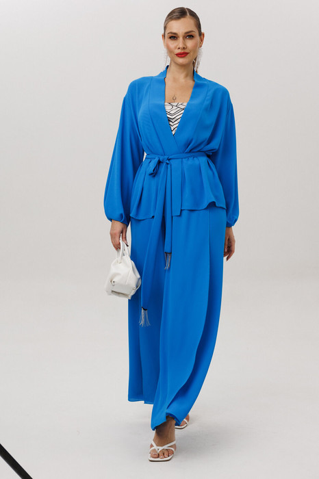 Элегантный вечерний костюм-двойка, состоящий из блузки свободного кроя и широких брюк. Красивый и эффектный брючный костюм - это идеальный образ для особых случаев, вечерних выходов, праздничных и торжественных мероприятий, будь то корпоратив, свадьба, юбилей, выпускной, день рождения, Новый год  Блузка прямого силуэта  со пущенной линией плеча. Рукав двойной, расширенный к низу со складками. По спинке и полочке идет планка. В комплекте с блузкой идет съемный пояс. На концах пояса металлизированная бахрома. Брюки прямые  с запахом по переду, пояс на резинке.Благодаря фасону и крою, костюм визуально вытянет силуэт, сделает фигуру стройнее, подчеркнет ее достоинства, скроет недостатки. Элегантный брючный костюм от Anastasia-   комфорт и уверенность в себе на любом мероприятии Длина блузки: (48-56)-61см. Длина рукава-52см. Длина брюк:(48-54)-105см., (56)-108см.