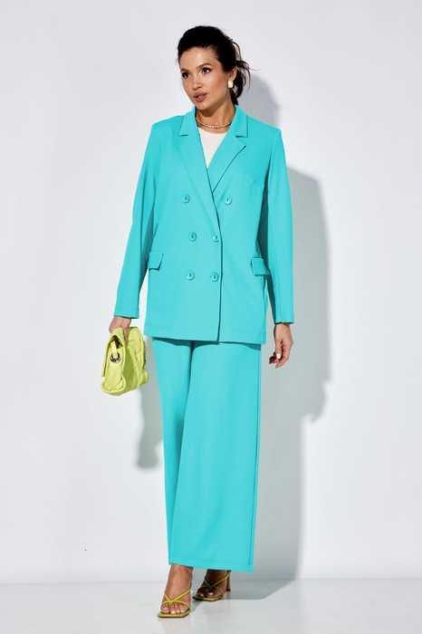 Костюм женский 2-х предметный: жакет и брюки. Жакет полуприлегающего силуэта: бочок с выточкой по полочеке, по спинке средний шов. Застежка двухбортная, карман клапан "обманка".  Рукав двухшовный. Брюки прямые .По полочке карман и складки. Пояс на резинке. Длина жакета: 73см . Длина рукава: 62см. Длина брюк: 100 см.