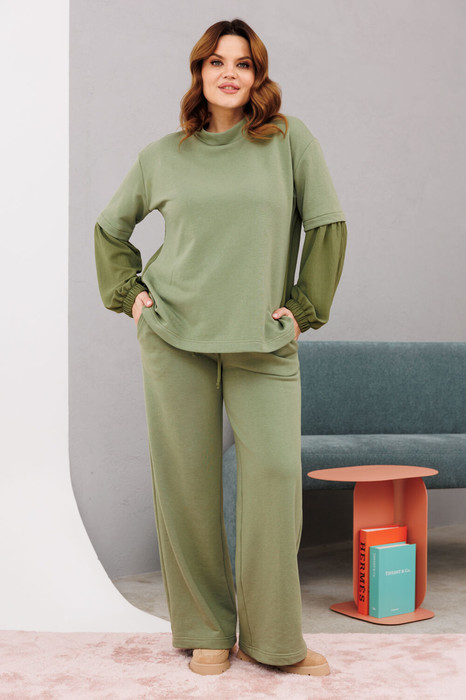 Шикарный трикотажный женский костюм от бренда Anastasia, идеальный для любого случая. Этот костюм сочетает в себе элегантность и комфорт, что делает его подходящим как для деловых встреч или домашней одежды, так и для праздничных мероприятий. Джемпер прямого силуэта со спущенным плечом. Полочка трикотажная. По спинке идет отрезная кокетка и вставка из отделочной ткани со встречной складкой по центру, низ фигурный. Воротник - стойка. По рукаву идет подрез из отделочной ткани. Сверху по подрезу сборка, низ рукава на резинке. Брюки прямые, пояс на резинке с завязками, по бокам карманы.Это не только универсальная одежда для деловых встреч или прогулок. Подойдет как для взрослых женщин, так и для подростков. Отдельный части костюма легко будут сочетаться с вещами из Вашего гардероба. Модель можно отнести к стилю спортивный кэжуал, спортивный шик. Костюм можно носить с кроссовками или ботинками. Обязательно добавьте наш бренд в избранное и следите за новинками, распродажами, скидками и акциями! Хороших покупок от «Анастасия» Длина джемпера (по спинке):(48-52)- 68см, (54-58)-71 см. Длина рукава: (48-52)-57см, (54-58)-59см. Длина брюк: (48-52)- 103см, (54-58)-106см