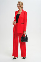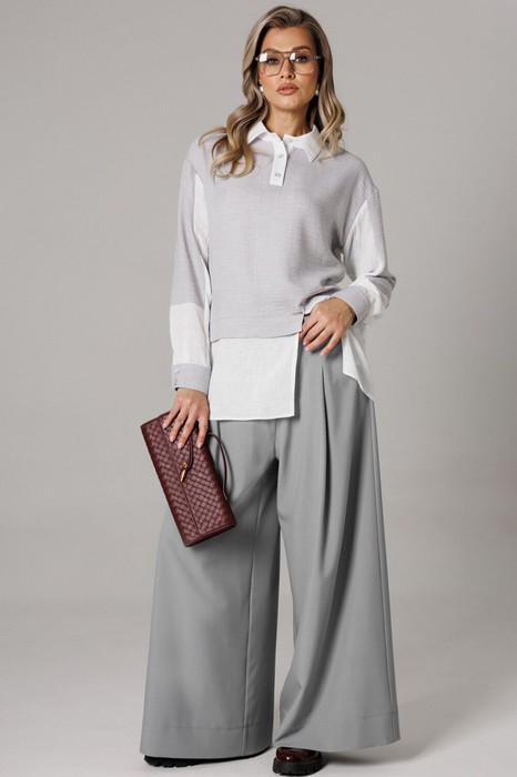 Комплект из костюмной ткани создан для тех, кто ценит комфорт и элегантность в каждой детали. В комплект входит блузка и штаны палаццо. Оверсайз крой придаёт костюму особый шарм и дает свободу движений. Высокая посадка и резинка по поясу подчёркивает талию и делает силуэт более изящным. Благодаря свободному крою костюм подойдёт для разных типов фигуры. Он подчеркнёт вашу индивидупльность. Блузка прямого силуэта, застежка на планку и пуговицы. Воротник на отрезной стойке. По полочке идет ассиметричный подрез со вставками из 2-х видов однотона и разрезом. Плечо спущенное, рукав длинный со вставками, на манжете. По спинке идет кокетка и встречная складка. Брюки полаццо , прямые с односторонней складкой и запахом по центру. По низу брюк широкая подгибка. Пояс на резинке . В качестве декора- брендированная металлическая нашивка по подрезу полочки. Длина по спинке (50-54) - 74 см, (56-60) - 76 см. Длина рукава (с манжетой): (50-54) - 57 см, (56-60)-59см. Длина брюк: (50-54) - 97 см, (56-60) - 98см