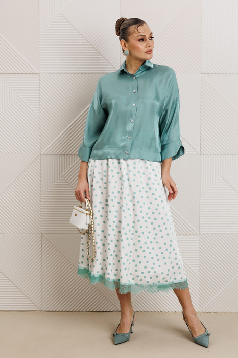 Комплект женский 2-х предметный (блузка, юбка). Отлично подойдет на любой тип фигуры, подчеркнет вашу женственность.  Блузка из вискозной  ткани с легким блеском прямого  силуэта со спущенным плечом. Застежка- планка на петли и пуговицы. Воротник на отрезной стойке. Рукав одношовный, втачной, 3/4 длины с манжетой. В качестве декора- по манжете пуговицы, по низу блузки широкая подгибка с отстрочкой.  Юбка на прикотажной подкладке, расширенная к низу. Пояс на резинке. По низу юбки - отделка кружево. Отдельные части комплекта будут лекго сочитаться с вещами из вашего гардероба. Длина блузки (50-54)- 53см, (56-62)- 55см . Длина рукава (50-62)-32см. Длина юбки (50-62)-91см.