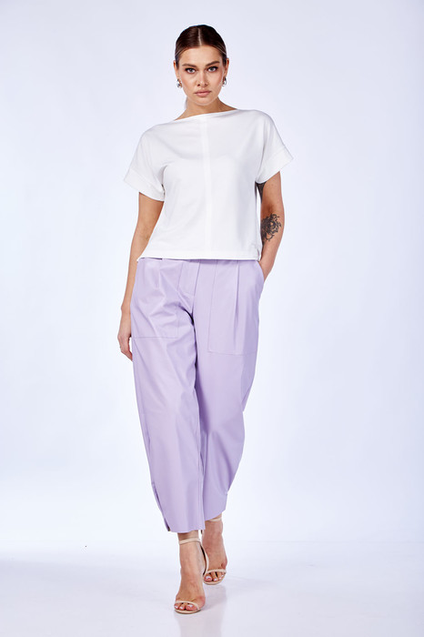 Комплект женский 2-х предметный (топ и брюки). Топ прямого силуэта из трикотажного полотна со спущенным плечом, по бокам разрезы, спинка длиннее чем полочка. По центру полочки и спинки - отделачная строчка. Рукав в виде манжены, вырез горловины в форме лодочки. В качестве отделки по низу полочки - нашивка. Брюки бананы из Эко-кожи. Укороченные, сужающиеся к низу за счет встречной складки. По переду идут подрезные карманы и складка по линии талии. Застежка на молнию.  Пояс отрезной с резинкой. Топ и брюки можно легко совмещать с другими предметами вашего гардроба. Длина спинки(46-50)-55 см, (52-54)-58см.  Длина рукава (манжета): (46-54)-4 см. Длина брюк: (46-50)-94см, (52-54)-96см.
