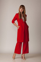 Костюм женский состоящий из топа, жакета и брюк выполнен из однотонной ткани двух контрастных цветов.