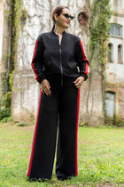 Костюм состоит из жакета и брюк. Костюм выполнен из однотонной ткани. Жакет прямого силуэта, без подкладки.   Полочка жакета с вертикальными рельефами и двубортной застежкой на две пуговицы. Горловина V-образной формы. На нижней части полочки выполнены накладные карманы. Спинка со средним швом и отрезными бочками. Рукав длинный, втачной, двухшовный. Брюки со стрелками, длиной до косточки. В верхней части брюки прилегающие, в колене свободные и к низу зауженные. По передним половинам обработаны карманы, в среднем шве застежка на молнию. На задней половине обработаны талиевые вытачки.  Брюки на притачном поясе с эластичной тесьмой и шлевками. Застежка по поясу на петлю и пуговицу.