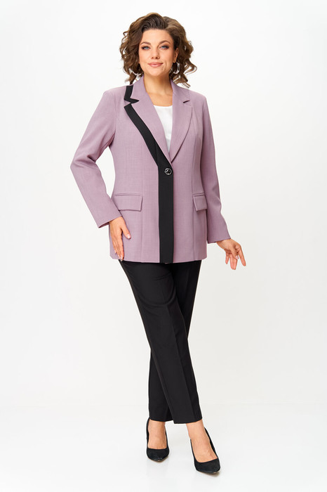 Костюм состоящий из жакета и брюк выполнен из однотонной ткани в контрастном сочетании светлого и темного цветов.