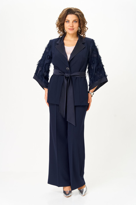 Костюм состоящий из жакета и брюк выполнен из однотонной ткани, в качестве отделки использован шифон с обьемным жаккардовым рисунком и однотонный атлас в цвет основной костюмной ткани.