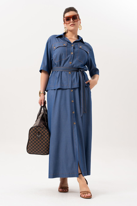 Костюм женский юбочный. Блузка с воротником на стойке, с центральной бортовой застёжкой на петли и пуговицы, на полочке нагрудные карманы с клапанами, застёгивающиеся на петли и пуговицы, со сьёмным поясом, с  втачными рукавами 3/4. юбка на поясе по полочке с двумя шлёвками, по спинке на резинке. юбка по переду на пуговицах, с боковыми наклонными карманами. костюм с отделочными строчками.