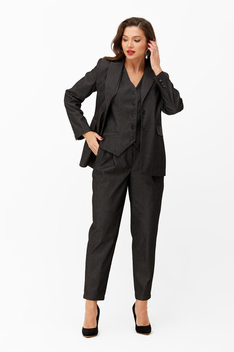 Костюм женский трех предметный, состоящий из жакета, жилета и брюк. Жакет полуприлегающего силуэта с центральной застежкой на петли и пуговицы, с пиджачным воротником, с втачными рукавами. Перед с нагрудными вытачками, отрезными бочками, прорезными карманами «в рамку» с клапаном и прорезным с листочкой.   Спинка с отрезными бочками и средним швом. Рукава двухшовные со шлицей.