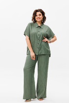 костюм женский из льна. Кимоно оверсайз, длиной до середины бедра. Рукав 3/4, низ широкий на манжете, без застежки. По переду фигурный запах. Талию можно подчеркнуть при помощи съемного пояса или комбинировать с корсетом.