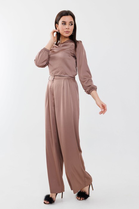 Брюки женские, высокая посадка, длинные, расширенные к низу. По переду защипы моделирующие фигуру и боковые карманы. По спинке талиевые вытачки. Притачной пояс на петли пуговицы, по переду застежка молния, по спинке вшита эластичная лента, есть шлевки.