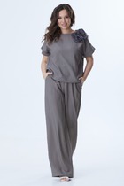 Прямой двухбортный жакет, брюки на резинке по спинке и с карманами.
