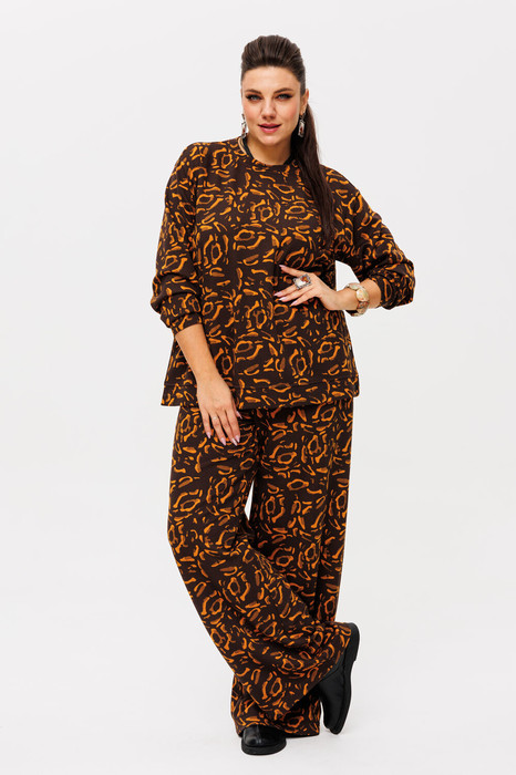 Трикотажный костюм от Анелли  с анималистичным, ярким принтом – это идеальное сочетание стиля и комфорта для повседневного гардероба. Он включает в себя просторные брюки палаццо на круговой резинке, что обеспечивает удобную посадку и легкость в движении. Благодаря свободному крою и функциональным карманам, брюки смотрятся элегантно и практичны в носке.
