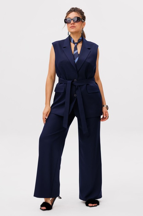 Этот элегантный костюм, состоящий из жилета и брюк, воплощает в себе утонченность и уверенность. Полуприлегающий силуэт жилета мягко подчеркивает линии фигуры, создавая гармоничный баланс между строгостью и женственностью. Однобортная застёжка на петли и пуговицы придает образу аккуратность и завершенность, а отложные лацканы воротника добавляют ноту классической сдержанности.