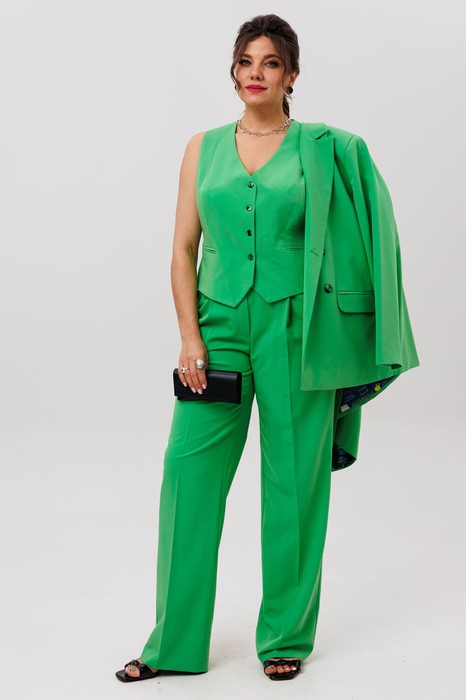 Этот костюм цвета «ирландский зеленый» - воплощение безупречного вкуса и современной женственности. Его насыщенный, глубокий оттенок подобен первому весеннему листку, пробуждающему город от серой дымки. Это не просто ансамбль, а капсула для вдохновения: двубортный жакет свободного прямого кроя с четкими лацканами и функциональными карманами задает тон уверенной элегантности.