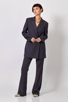 Свободный жакет с мягким отложным воротником и лацканами, двубортная застежка которого застегивается на две лаконичные пуговицы, создает расслабленный, но при этом собранный силуэт. Его цельнокроеные рукава длины три четверти изящно открывают запястья, а боковые разрезы придают образу воздушность и свободу движений, дополняясь тонким поясом, который позволяет менять акценты по настроению.