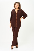 Брюки костюма отличаются продуманным кроем и максимальным комфортом благодаря эластичной резинке на поясе, которая обеспечивает идеальную посадку на любой фигуре. Практичные карманы, искусно вшитые в боковые швы добавляют функциональности модели. Силуэт брюк элегантно расширяется к низу, а завершающий кружевной декор создает единую стилистическую композицию с джемпером, подчеркивая изысканность всего образа.