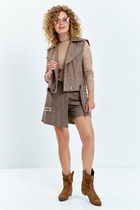 Жилет прилегающего силуэта с центральной бортовой застежкой на петли и пуговицы, на подкладке. Вырез горловины V-образной формы. Перед - с талиевыми вытачками и прорезными карманами с листочкой. Спинка со средним швом и талиевыми вытачками.