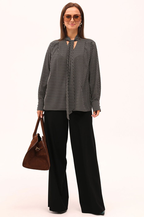 Стильный брючный комплект, состоящий из свободной блузки и брюк-палаццо. Элегантный бант на блузке подчеркнет Вашу женственность и романтичность. Эффектный комплект идеально подойдет для рабочих будней, а также для дружеских встреч и романтических прогулок.