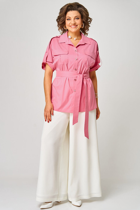 Блузка свободного силуэта. Воротник отложной, на притачной стойке. Перед блузки с центральной застежкой на петли и пуговицы на притачных планках и накладными карманами со складкой и клапаном. Спинка с кокеткой. Рукав цельнокроеный короткий с декоративной патой, понизу — притачная манжета. Для подчеркивания талии в комплекте идет съемный пояс из основной ткани.
