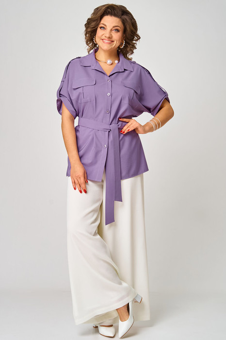 Блузка свободного силуэта. Воротник отложной, на притачной стойке. Перед блузки с центральной застежкой на петли и пуговицы на притачных планках и накладными карманами со складкой и клапаном. Спинка с кокеткой. Рукав цельнокроеный короткий с декоративной патой, понизу — притачная манжета. Для подчеркивания талии в комплекте идет съемный пояс из основной ткани.