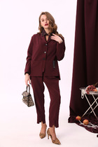 Комплект 2-х предметный состоящий из жакета и брюк. Жакет женский на подкладке с подплечниками укороченный. V образный вырез горловины, воротник с плавным срезом, остроугольные лацканы. Рукав втачной. Застежка центральная на петлю пуговицу. По переду изделия накладные карманы. Спинка цельнокроеная. Длина жакета 47, длина рукава 59. Брюки прямого кроя. Пояс брюк стабильный, по поясу нашиты шлевки. По переду декоративные складки. По переднему и заднему полотну брюк заутюженные стрелки. Карманы «хулиганы». Длина брюк 100 см.
