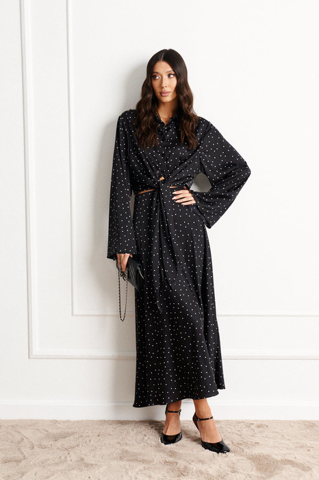 Комплект состоит из рубашки и юбки, выполнен из черного полотна с контрастным принтом - мелкий горох. Характеристики: рубашка прямой крой, по переду цельнокроеные завязки, отложной воротник, рукав втачной свободного кроя, застежка центральная на петли пуговички. Длина рубашки по спинке 42 см, длина рукава от края горловины 64 см. Юбка свободного кроя, А-образного силуэта, подкладка, пояс цельнокроеный на резинке. Длина брюк 97 см