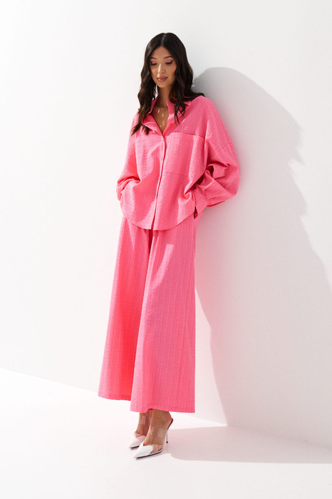 Комплект состоит из рубашки и брюк выполнен из фактурного розового полотна. Характеристики: рубашка прямого, ассиметричного кроя, спинка в изделии короче, отложной воротник, застежка центральная на петли пуговицы, по переду крупный карман, рукав спущен, по низу рукава манжета, по переду изделие с плавным срезом. Длина по спинке 48 см, длина по передней части 61 см, длина рукава от края горловины 78 см. Брюки прямого кроя, пояс на резинке с кулиской, в боковых швах карманы. Длина брюк 99 см.