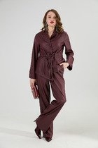 Комплект состоит из джепера и брюк выполнен из полупрозрачного полотна розового цвета. Характеристики: джемпер прямого свободного кроя, овальный широкий вырез горловины, рукав спущен. Длина по спинке от края горловины 72 см, длина рукава от края горловины 75 см. Брюки прямого, свободного кроя, пояс брюк на резинке. Длина брюк по боковой линии - 110 см.