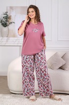 Костюм женский из трикотажного полотна, состоящий из футболки и бриджей.Футболка женская из гладкокрашеного трикотажного полотна «кулирка» классического покроя, с короткими втачными рукавами, горловиной овальной формы, обработанной втачной планкой, и принтом на полочке, выполненным в технике шелкографии.