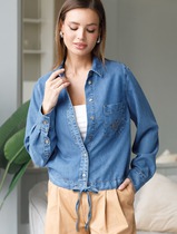 Блузка свободного покроя с воротником на стойке, рукав втачной по низу на манжете, застежка на планке на петли и пуговицы, по переду накладные карманы.