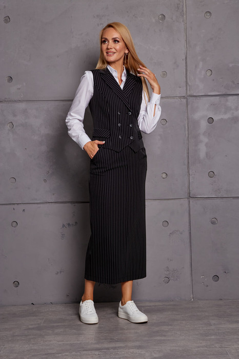 Комплект женский юбочный, состоит из жилета и юбки. Жилет укороченный, двубортный с отложным воротником с лацканами, по переду и спинке вертикальный рельефы, по переду обманки-клапаны, изделие на подкладке. Юбка прямая, зауженная к низу, на поясе, застёжка сзади на молнию и пуговицу, с боковыми карманами, сзади шлица, изделие на подкладке.