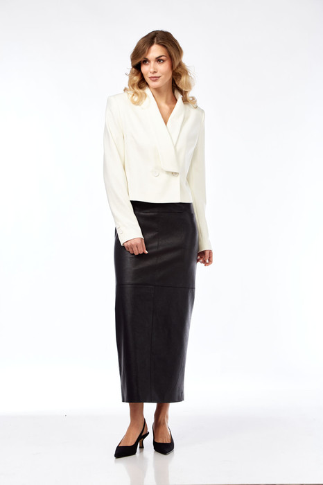 Комплект состоящий, из жакета и юбки. Жакет укороченный прямого силуэта с втачным рукавом и воротником отложным до линии талии, застёжка двух бортная на петли и пуговицы. Изделие на подкладке. Юбка их кожзаменителя узкая прямая, длинная. По заднему полотнищу шлица и застёжка в среднем шве. По переду карманы в подрезах.