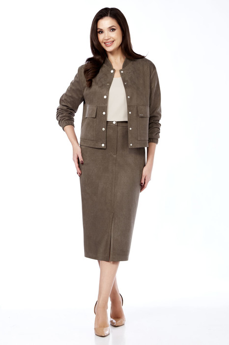 Женский двухпредметный костюм, состоящий из свободного жакета и облегающей юбки с пикантным разрезом по центру,выполнен из трикотажного полотна под "вельвет".