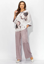 Женский нарядный двухпредметный костюм состоит из блузы и брюк с имитацией юбки спереди,выполнен из плательно-костюмной однотонной ткани с блестящим напылением.