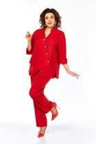 Женский двухпредметный нарядный костюм состоит из асимметричного жакета и брюк, выполненных из однотонной плательно-костюмной ткани.