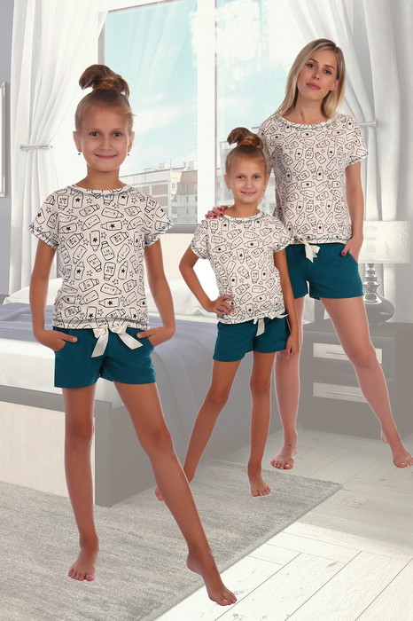 Костюм-двойка детский. Шорты с отрезным поясом и карманами. На поясе декоративный бант из атласной ленты. Свободная футболка со спущенным плечом. Декоративная контрастная отстрочка по горловине, низу изделия и среднему шву спины