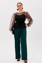 Брюки свободные, расширенного силуэта вверху и слегка зауженные к низу. С верхними наклонными глубокими складками и с двумя верхними боковыми карманами. Низ брюк оформлен декоративными патами с пуговицей. Высота сиденья стандартная.
