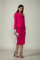 Комплект женский-двойка, из текстильной ткани, жакет удлиненный, полуприлегающего силуэта с центральной бортовой застежкой на пуговицы до линии перегиба лацкана. Спереди рельефные швы от плечевого шва, отрезной бочок и карман с клапаном. Спинка с рельефами от плечевого шва. Рукав втачной, двухшовный. Воротник пиджачного типа. Жакет на подкладке, длина по спинке 67 см, длина рукава 62 см. Брюки прямые,классические, с заутюженными стрелками,по переду обработаны карманы с отрезным бочком,застежка на тесьму-молнию и 1 пуговицу.На задних половинках обработаны вытачки и имитация карманов с листочкой, пояс в брюках притачной. Длина брюк от талии по боковому шву 100 см.