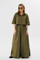 Комплект женский, 2-х предметный, состоит из жакета и и брюк. Жакет женский удлиненный, из текстильной ткани, на подкладке, полуприлегающего силуэта с центральной бортовой застежкой на пуговицы до линии перегиба лацкана. Спереди рельефные швы от плечевого шва, отрезной бочок и карман с клапаном. Спинка с рельефами от плечевого шва. Рукав втачной, двухшовный. Воротник пиджачного типа. Длина по спинке 66 см, длина рукава 62 см.Брюки прямые,классические, с заутюженными стрелками,по переду обработаны карманы с отрезным бочком,застежка на тесьму-молнию и 1 пуговицу.На задних половинках обработаны вытачки и имитация карманов с листочкой, пояс в брюках притачной. Длина брюк от талии по боковому шву 105 см.
