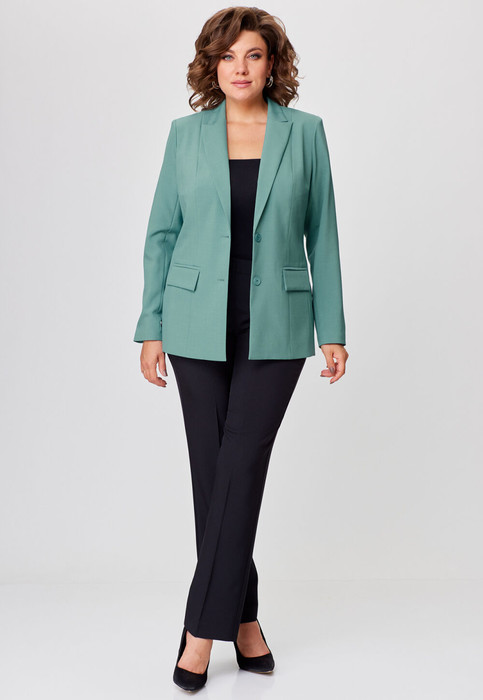 Комплект женский-двойка, из текстильной ткани, жакет удлиненный, полуприлегающего силуэта с центральной бортовой застежкой на пуговицы до линии перегиба лацкана. Спереди рельефные швы от плечевого шва, отрезной бочок и карман с клапаном. Спинка с рельефами от плечевого шва. Рукав втачной, двухшовный. Воротник пиджачного типа. Жакет на подкладке, длина по спинке 67 см, длина рукава 62 см. Брюки прямые, классические, с заутюженными стрелками, по переду обработаны карманы с отрезным бочком, застежка на тесьму-молнию и 1 пуговицу. На задних половинках обработаны вытачки и имитация карманов с листочкой, пояс в брюках притачной, по боковому на резинке. Длина брюк от талии по боковому шву 103 см.