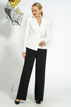 Комплект женский-двойка, из текстильной ткани, жакет удлиненный, полуприлегающего силуэта с центральной бортовой застежкой на пуговицы до линии перегиба лацкана. Спереди рельефные швы от плечевого шва, отрезной бочок и карман с клапаном. Спинка с рельефами от плечевого шва. Рукав втачной, двухшовный. Воротник пиджачного типа. Жакет на подкладке, длина по спинке 67 см, длина рукава 62 см. Брюки прямые, классические, с заутюженными стрелками, по переду обработаны карманы с отрезным бочком, застежка на тесьму-молнию и 1 пуговицу. На задних половинках обработаны вытачки и имитация карманов с листочкой, пояс в брюках притачной. Длина брюк от талии по боковому шву 103 см.