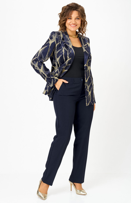 Комплект женский-двойка, из текстильной ткани, жакет удлиненный, полуприлегающего силуэта с центральной бортовой застежкой на пуговицы до линии перегиба лацкана. Спереди рельефные швы от плечевого шва, отрезной бочок и карман с клапаном. Спинка с рельефами от плечевого шва. Рукав втачной, двухшовный. Воротник пиджачного типа. Жакет на подкладке, длина по спинке 67 см, длина рукава 62 см. Брюки прямые, классические, с заутюженными стрелками, по переду обработаны карманы с отрезным бочком, застежка на тесьму-молнию и 1 пуговицу. На задних половинках обработаны вытачки и имитация карманов с листочкой, пояс в брюках притачной. Длина брюк от талии по боковому шву 103 см.