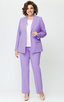 Комплект женский, 2-х предметный, состоит из жакета и и брюк. Жакет женский удлиненный, из текстильной ткани, на подкладке, полуприлегающего силуэта с центральной бортовой застежкой на пуговицы до линии перегиба лацкана. Спереди рельефные швы от плечевого шва, отрезной бочок и карман с клапаном. Спинка с рельефами от плечевого шва. Рукав втачной, двухшовный, по низу рукава обработана шлица на петли-пуговицы. Воротник пиджачного типа. Длина по спинке 66 см, длина рукава 62 см.Брюки прямые,классические, с заутюженными стрелками,по переду обработаны карманы с отрезным бочком,застежка на тесьму-молнию и 1 пуговицу.На задних половинках обработаны вытачки и имитация карманов с листочкой, пояс в брюках притачной. Длина брюк от талии по боковому шву 103 см.