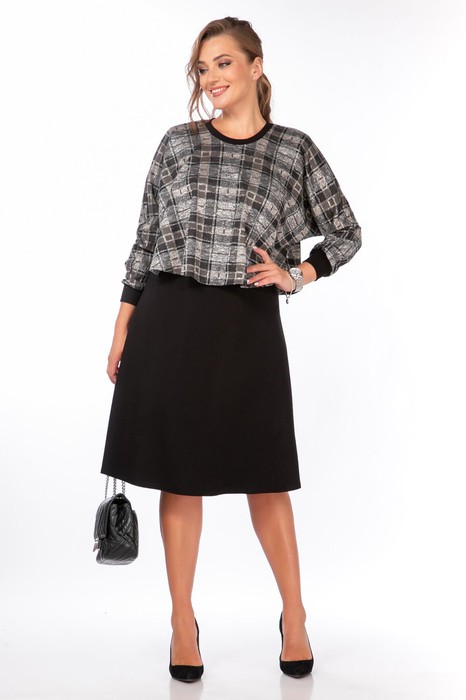 Платье женское свободного силуэта, двухпредметное. Нижняя часть платья однотонная, без рукав и застежки. Верхняя часть выполнена из контрастной трикотажной ткани ввиде накидки. Крой летучая мышь, манжет и горловина обработаны притачным довязом.